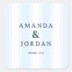 This elegant wedding sticker features a minimalist design with alternating light blue and white vertical stripes, creating a subtle yet sophisticated background. The clean serif typography in dark navy highlights the names "Amanda & Jordan" as customizable placeholders, while the phrase "thank you" adds a touch of gratitude below. The modern and understated style conveys refinement and appreciation, making it perfect for expressing thanks at your special event. Its simple composition and soft color palette ensure it complements any wedding theme beautifully.