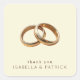This square sticker features a minimalist and elegant design with two interlocking gold rings set against a soft beige background. The layout is clean, with ample negative space that highlights the polished metallic finish of the rings. Below the rings, simple sans-serif typography reads "thank you" in light letters, followed by names in bolder uppercase font, creating a cohesive visual hierarchy. The overall style exudes sophistication and celebration, making it perfect for expressing gratitude at weddings or special occasions.
