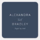 This elegant square sticker features a sophisticated design with a deep navy blue background and crisp white text. The layout is minimalistic, showcasing two names in an uppercase serif font, connected by a stylish cursive "and," creating a balanced and formal appearance. Below the names, a date is displayed in the same refined typeface, maintaining symmetry and clarity. The overall mood is one of classic elegance, making it perfect for special occasions like weddings or anniversaries, where simplicity and sophistication are key.