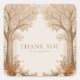 Step into a world of vintage charm and rustic elegance with this beautiful forest thank you sticker. The design features a stunning, painterly illustration rendered in a warm, muted palette of browns, beiges, and creams, evoking a timeless, antique feel. Two majestic trees with detailed bark form a graceful natural arch, framing a central space set against a subtly textured, light beige background. The forest floor is richly detailed with lush undergrowth, featuring various leaves and delicate, creamy-white star-shaped flowers. A minimalist, thin, textured bronze-gold frame provides a sophisticated border for your message, complementing the overall vintage woodland aesthetic. These stickers are perfect for businesses with a natural, rustic, or vintage aesthetic, such as artisans working with wood or natural fibers, boutique stationers, antiquarian booksellers, rustic wedding venues or planners, or heritage brands. This versatile design can also be used to beautifully seal envelopes for woodland-themed weddings, formal events, or as a sophisticated accent on party favors and gift wrapping.