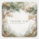 Step into a world of serene, rustic beauty with this enchanting forest thank you sticker. The design features a stunning, painterly watercolor landscape of a tranquil woodland clearing, rendered in a sophisticated, muted earthy palette. Two majestic, beautifully detailed trees in shades of green and golden-brown form a natural arch, framing a soft, misty background where distant mountains fade into fog. The foreground is rich with intricately drawn undergrowth, featuring ferns, small wildflowers, and a winding dirt path, evoking a sense of peaceful seclusion. The central area provides a light, subtly textured space for your message. These stickers are perfect for businesses with a natural, rustic, or artistic aesthetic, such as artisans inspired by nature, boutique stationers, landscape designers, rustic event venues or wedding planners, or fine art photographers. This versatile design can also be used to beautifully seal envelopes for woodland-themed weddings, formal events, or as a sophisticated accent on party favors and gift wrapping.