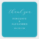This square sticker features a minimalist and elegant design with a solid teal background. The layout includes a cursive "thank you" at the top, followed by two names in clean, uppercase sans-serif font, creating a balanced composition. The overall style is modern and sophisticated, perfect for expressing gratitude on special occasions like weddings or formal events. The calming color palette and simple typography convey a polished and appreciative tone, making it ideal for personalizing gifts or thank-you notes.