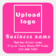 Adesivo personalizável que você pode colocar seu nome comercial, endereço e número de telefone. Você pode usá-lo como material de marketing para anunciar sua empresa ou para promover seu nome de marca a clientes ou clientes. Autocolante que você pode usar para criar reconhecimento de nome de marca. Você também pode usá-lo como acessório de materiais de embalagem de produtos. Designs são textos brancos sobre fundo rosa e forma quadrada. Para personalizar este adesivo, carregue o logotipo da sua empresa, digite o nome da sua empresa ou empresa, endereço e número de telefone. Após carregar o logotipo e digitar textos, verifique a aparência. Se a aparência lhe agrada, você pode colocar seu pedido agora. Se precisar redimensionar e mover o logotipo e as mensagens para o ajustado neste adesivo ou em outros tamanhos que você escolher, mude na ferramenta design. Você também pode fazer outras alterações de acordo com a aparência preferida na ferramenta design, como alterar a cor do fundo, a cor da fonte e o estilo da fonte.