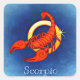A ilustração colorida apresenta fundo azul com um escorpião vermelho - o símbolo do sinal zodiaco astrológico Scorpio (23 de outubro-21 de novembro).
