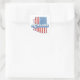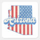 Adesivo quadrado patriótico apresenta estrelas e listras dos EUA preenchendo a silhueta do estado do Arizona, com texto em estilo retrô..