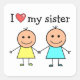Bonitas figuras de palito, uma vestindo um vestido amarelo e a outra um vestido azul, segurando mãos com sorrisos grandes e felizes. Acima das meninas em letras negras estão as palavras que amo minha irmã. A palavra amor foi substituída por um bonito coração vermelho de amor com uma borda fraca.