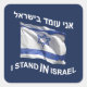 Não fique apenas com Israel; fique em Israel. Possui uma bandeira israelense. O texto em inglês abaixo da bandeira diz: "I STAND IN ISRAEL." O texto hebraico acima da bandeira diz, "Ani omed b'Yisrael" (א נ ע ו מ ד ב י י ש ר א). Venha para casa, faça aliyah. Junte-se àqueles que eram nasceres aqui e àqueles que vieram para casa. Não há mais maneira de mostrar o vosso apoio a Israel do que de se tornarem cidadãos e viverem aqui.