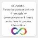 Este adesivo é uma forma simples, mas eficaz de comunicar aos outros que você ou um ente querido é autista e pode precisar de suporte adicional ou acomodações. A mensagem é clara e fácil de ler, fazer-a uma ferramenta excelente para os indivíduos autistas usarem em diversas situações, desde a escola ou do trabalho até eventos sociais. É uma maneira perfeita de sensibilizar sobre o autismo e promover compreensão e inclusão.