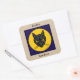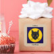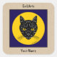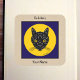 Uma ilustração retrô do rosto de um gato preto com olhos amarelos aparece em um círculo semelhante à lua nesta arte original apropriada para o Halloween de Richard H. Fay.