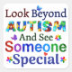 Citação inspiradora de "Olhe além do AUTISM e veja alguém especial" com quebra-cabeça coloridos de autismo para apoiar crianças autistas e suas famílias.
