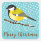 O adesivo do tema natalício com a ilustração original de desenho animado de Destei de um Excelente bonito / Parus Major bird. O pássaro tem cor amarela e preta nele. A cor de fundo é azul com um padrão de neve branca. Sob o pássaro, lê-se "Feliz Natal" em texto castanho.