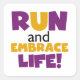 Se você gosta de correr, correr 5Ks, 10Ks, meia maratona, ou maratonas, você vai adorar este design de texto colorido em roxo e amarelo que lê Run and Embrace Life! Corra e Abraça Camisas de Vida, capuzes, ímãs, botões, cartões, adesivos, correntes-chave e muitos outros itens para corredores que adoram um design brilhante e colorido!