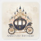 Esta elegante design apresenta uma carruagem de conto de fadas feminina em azul marinho com um castelo princesa atrás adorado com florais cor-de-rosa pincelados.