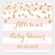 adesivos de etiqueta favoritos do chá de fraldas no padrão de listras brancas e cor-de-rosa claro, cor-de-rosa e branco, com um confete dourado, por favor note que o brilho é apenas efeito fotográfico. Uma maneira excelente de decorar favores do chá de fraldas.
