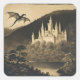 Um castelo majestoso e torrencial construído ao lado de uma montanha, cercado por uma paisagem mágica de colinas rolantes, florestas e um rio cintilante. Os dragões sobrevoam, e o castelo é iluminado pela luz do ouro do sol.