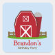 Um adesivo de festa de aniversário com ilustração de um celeiro vermelho com silo e cerca marrom. Personalize o texto vermelho e marrom.