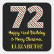 Este simples e divertido Natal temático e aniversariante, temático, design de 25 de dezembro, apresenta um grande número "72" com um padrão verde, branco e vermelho de listras, juntamente com a mensagem "Feliz 72º Aniversário e Feliz Natal", e um nome editável. O fundo é preto colorido. Os adesivos como este podem ser usados na preparação de presentes que estão a ser dados a alguém cujo aniversário de setenta e dois anos cai no dia de Natal (25 de dezembro). [~Z0000409]