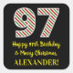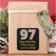 Este divertido e simples tema de Natal e design de 25 de aniversário de dezembro, temático de aniversário, apresenta um grande número de "97", com um padrão verde/branco/vermelho de listras. Também apresenta a mensagem "Feliz 97º aniversário e Feliz Natal", e um nome personalizável. O fundo é preto colorido. Os adesivos como este podem ser uma maneira divertida de preparar presentes ou presentes que estão a ser dados a alguém que foi nascer no Natal (25 de dezembro) e que está a celebrar o seu 90º aniversário. [~Z0000409]