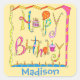 Estes autocolantes personalizados são divertidos para a festa de aniversário de uma criança. O adesivo Feliz de Aniversário apresenta arte branca desenhada à mão usando balões, um cupcake e bolo de aniversário, pontos e listras para ajudar a formar as letras. As palavras de aniversário feliz estão cercadas por uma borda reluzente que se destaca em um fundo amarelo. As letras são em multicores de verde, laranja, cor-de-rosa quente fúcsia, azul-turquesa e verde. Personalize com um nome abaixo da palavra arte para que autocolantes ajudem com uma celebração ou festa de aniversário.