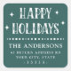 Pine verde, verdinho, etiquetas de endereço de ida e volta de inverno com o texto "Felizes Feriados" em uma fonte festiva flanqueada por estrelas retrógradas. Abaixo está um divisor de pontos e seu endereço de retorno. Texto branco sobre fundo verde-pinho. Todas as cores são personalizáveis. Mova e redimensione elementos e texto com a ferramenta design.