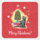 Esta é uma bela design de Natal com cheio vermelho vibrante de fundo de estrelas e minúsculos flocos de neve e com um gato bonito em frente a uma árvore de Natal. Envie suas vibrações amáveis, confortáveis e celebrantes para seus entes queridos!