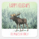 Um alce rústico de floresta na neve invernal contra árvores de neve; um adesivo feliz de feriados para seus presentes ou selos de envelope para cartões de saudação. Personalize com seu nome de família.