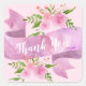 Adesivo quadrado rosa bege feminino e bonito com as palavras "Obrigada" em uma elegante letra cursiva branca, com um fundo de faixa de fita lilás roxa. Dois belos arranjos florais de aquarela de primavera com rosas cor-de-rosa e folhagens completam o design.