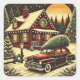 Férias de Natal com atmosfera retrógrada. A cena apresenta uma confortável cabana de montanha, coberta de neve, com pinheiros e um carro vintage com uma árvore de Natal no telhado, evocando uma atmosfera nostálgica de férias. A ilustração tem cores quentes e clássicas e um aspecto texturizado desenhado à mão.