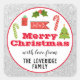 Festas festivas, vinheta prateada de Natal feliz com uma luz cintilante prateada brilha na borda e fundo branco. As palavras "Feliz Natal" estão escritas num roteiro vermelho ousado. O adesivo é decorado com pequenas ilustrações bonitinhas, como uma árvore de Natal, canas vermelhas e verdes de doces, um presente e folhas sagradas. Na parte inferior do adesivo estão as palavras "com amor de" e o sobrenome da sua família.