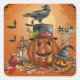 Um corvo negro senta-se sobre um Jack O Lanterna em frente a uma noite de Dia das Bruxas assustadora e lua. Feliz Dia das Bruxas! Convites, pratos, xícaras e muito mais estão disponíveis para uma festa de Halloween!