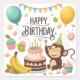Torne os aniversários ainda mais especiais com este design adorável com um macaco feliz em um chapéu de festa celebrando com um delicioso bolo, balões coloridos e doces! Perfeito para convites de aniversário de crianças, cartões, lembrancinhas, decorações e presentes. Este design charmoso traz alegria e diversão para qualquer celebração de aniversário.