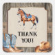 Vire-se e obrigado os seus convidados por virem a um cavalo andando na festa de aniversário. O fundo de uma prancha de madeira sugere o interior de um estábulo com um painel preso por precintas de burlap. O painel de cor creme tem um cavalo selado a obrigados convidados para vir a um dia divertido com cavalos. Um par de botas de cowboy e um chapéu são colocados na parte inferior do adesivo com ornamentos ao estilo ocidental acentuando o design. Disponível com produtos correspondentes.