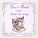 Bordas de prata ornamentadas vintage vitorianas com borboletas roxas, uma xícara de chá com flores e borboletas roxas, festa de chá de noiva, etiquetas de agradecimento impressas elegantes personalizadas