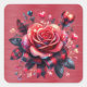 Um belo adesivo de uma rosa vermelha cintilante com fita xadrez, corações e flores em fundo vermelho.