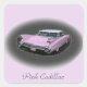 A obra de arte de um Cadillac clássico rosa de 1950, a partir da parte de trás, mostrando as asas clássicas e icônicas que o clássico carro americano é bem conhecido e amado.