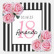 Um adesivo para a 18ª festa de aniversário. Listras verticais negras e brancas clássicas como fundo. Com rosas de flores rosadas femininas e femininas como decoração. Um quadro branco e preto na frente com modelo para idade, nome e data. Número 18 em rosa, nome e data em preto. O nome é escrito com um script de estilo manuscrito.