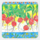 Um adesivo de legumes colorido com uma colheita de rabanetes vermelhos brilhantes, junto com flores margaridas, com fundo azul brilhante e amarelo desenhado com caneta preta e tinta com aquarela. Coloridos de arte de jardim para artesanato, jornalismo, escrevendo de cartas e muito mais! Esta design é do meu livro de colorir chamado "Lila's Garden: A Cottage Garden Coloring Book (Jardim da Lila: Um Livro de Coloração de Jardim de Algodão que pode ser encontrado na Amazônia).