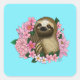 Uma preguiça bonita sentada entre flores cor-de-rosa contra um pano de fundo azul
