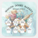 This charming watercolor illustration features a whimsical collection of French pastries and professional baking tools arranged in a vibrant cluster. A stack of multi-colored macarons, two glossy chocolate eclairs, and a slice of layered cream cake topped with berries serve as the centerpiece. They are accompanied by two golden-brown, flaky croissants. Integrated into the design are a wire whisk, a wooden rolling pin, and a piping bag ready for decorating. The artwork is beautifully accented with soft blue and pink watercolor washes and shimmering gold leaf flecks, creating an elegant, artistic tribute to the craft of pastry making.