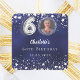 Fundo azul-marinho de cor irregular, decorado com estrelas prateadas falsas. Personalize e adicione uma foto, nome, idade, data.