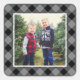 O design de adesivo de fotos de feriado quadrado apresenta sua foto favorita com uma cinza e um quadro de padrão de búfalo de verificação em preto. Dica: recorte sua foto em um formato quadrado antes de carregá-la no site. Crédito da fotografia: Duas Fotografias de Peixe www.twofishphoto.com