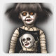 Boneca de Halloween assombrada com olhos laranja e máscara de crânio assustadora.