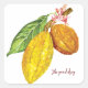 Theobroma cacao (cacaueiro ou cacau) é uma pequena árvore verde na família Malvaceae. O nome "cacau" é a hispanização do nome atribuído à planta em línguas indígenas Mesoamericanas, como kakaw em Tzeltal, Kiche e Maya Clássica; kagaw em Sayula Pooulca; e cacahuatl em Nahuatl, que significa "feijão de cacau". As suas sementes, cacau, são utilizadas para a produção de licor de chocolate, sólidos de cacau, manteiga de cacau e chocolate. Este adesivo de fruta de chocolate com coloração aquática, se divertido e decorativo. O texto é personalizável.
