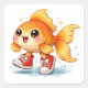 Adorable kawaii goldfish cartoon wearing cute red sneakers, with big shiny eyes and a joyful expression. Splashing water adds playful motion, making this vibrant illustration perfect for stickers, t-shirts, kids designs, and fun branding. High-quality, colorful artwork ideal for print on demand, social media content, and creative projects that attract attention and boost engagement.