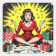 Add a little humor into their holiday season with this cute Christmas sticker with graphics of a funny retro pop art woman sitting in a pile of Christmas gifts, wrapping paper, scissors and bows.