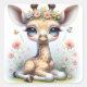 Uma girafa de bebê fofinha com grandes olhos azuis veste uma coroa de flores e está cercada por flores e borboletas cor-de-rosa