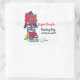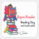 Leitura do dia em uma pilha de adesivos de eventos do livro. Personalize com a data e a conquista do evento do dia de leitura. Garoto super-herói original sentado em uma pilha de livros lendo desenho de livros de super-heróis e design por www.mylittleeden.com