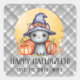 Um gato preto de aquarela doce em um chapéu de bruxa com abóboras, sobre um fundo xadrez cinza. Esses adesivos personalizados de Halloween são ideais para famílias que desejam adicionar um toque festivo às sacolas de doces, lembrancinhas de festa e presentes sazonais. Personalize com seu nome para tornar seus presentes de Halloween ainda mais especiais.