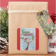 Ilustração de uma garota segurando um presente em uma mão e um pássaro em outra mão. Mensagem em africânder.