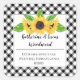 Um buquê rústico boêmio de girassóis encima seus nomes e endereço de retorno em um painel branco com bordas pretas acima de um fundo xadrez preto e branco diagonal neste alegre design de verão para outono. Design composto por Holiday Hearts Designs (direitos reservados).